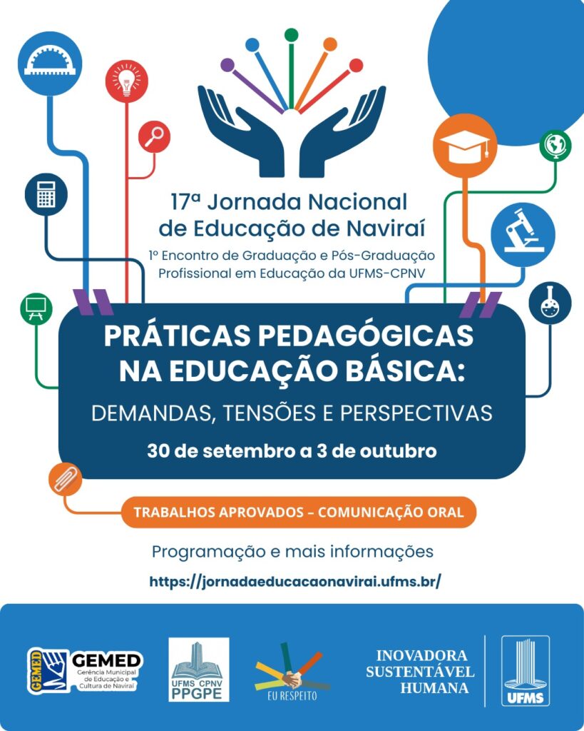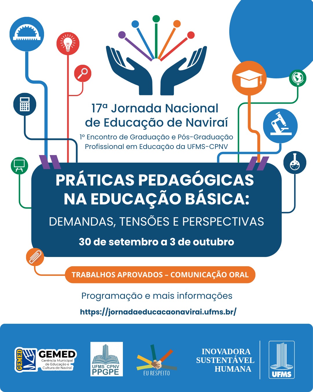 A Jornada Nacional de Educação de Naviraí é um evento que está em sua décima sétima edição, organizado pelo Curso de Pedagogia da UFMS, Campus de Naviraí e pelo Programa de Pós-Graduação Profissional em Educação da UFMS, Campus de Naviraí. Em sua décima sétima edição, o evento tem como foco “As práticas pedagógicas na educação básica”, estimulando reflexões acerca das tensões entre os processos que, estimulando encontros, sensibilidades e produção de conhecimento, motivam a resistência, e as atitudes de resignação e submissão que, em meio às demandas técnicas e mecânicas, anulam as subjetividades. Qual é a contribuição da escola, por meio de suas práticas pedagógicas, para favorecer vivências atentas à justiça, à democratização de saberes, à promoção de experiências com qualidades estéticas, à conscientização e ao combate às desigualdades e discriminações? Questionar, pensar, lidar com os limites e o alcance das práticas pedagógicas requer, também, atitudes reflexivas acerca dos perigos trazidos à escola por crenças mensuracionistas, pelas aplicações mecanicistas de novos currículos, pelo apego à técnica em detrimento do processo formativo trabalhado artística e eticamente, em prol da projeção de proposições e de ações críticas, e com potencial para transfigurar a realidade.